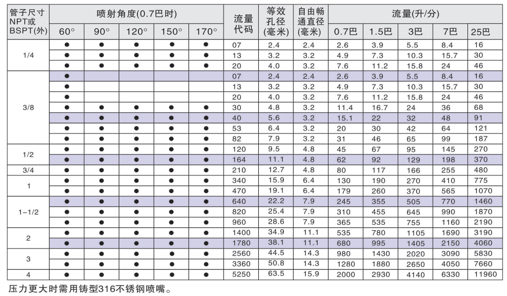 | 60°~170° | BSPT/NPT | 黄铜、不锈钢、塑料(PP/PVC/PTFE) 2205、2507、254Mo、钛合金等。 | 2.6~11960L/min | 0.7~25bar |