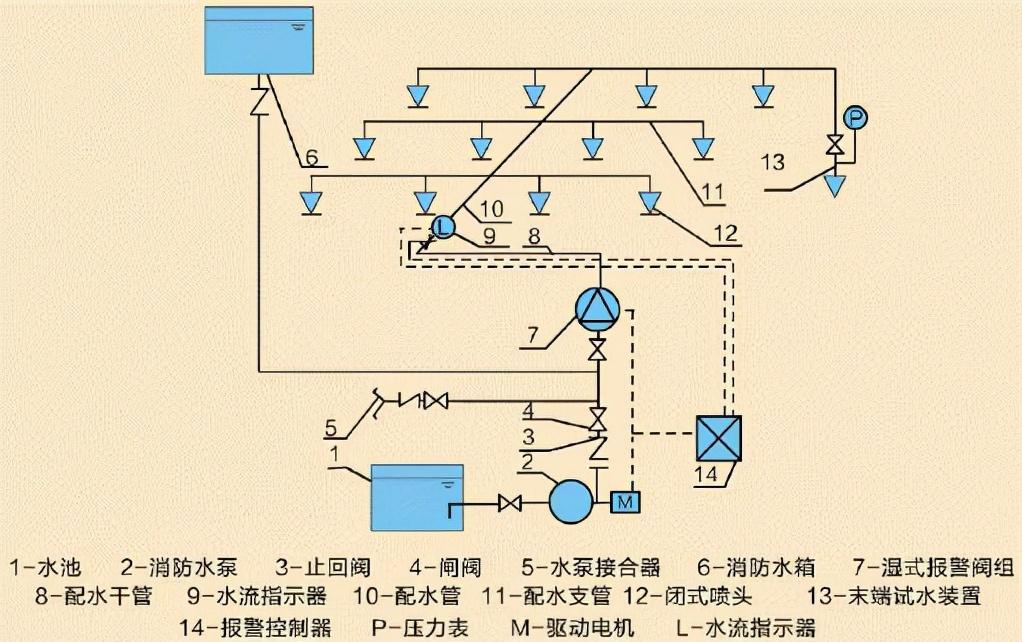 系统组成:湿式喷水灭火系统由末端试水装置、闭式喷头、压力开关、管道系统、水流指示器、湿式报警阀、报警装置和供水设施等组成。